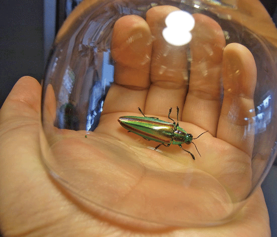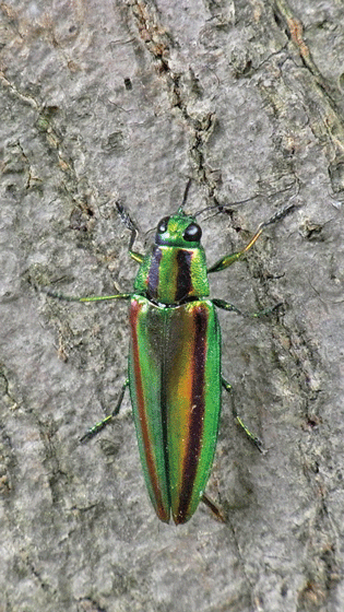 こんなに目立つ姿なのに、見たことがある人は少ないみたいだね。だからとっても珍しい昆虫じゃないかって思うでしょ。ヤマトタマムシの食べ物はエノキの葉っぱ。天王山のふもとにはりっぱなエノキがあるのでヤマトタマムシはたくさんいるんだ。長い捕虫網も届かない高いエノキの上の方にいるので気づかないだけさ。