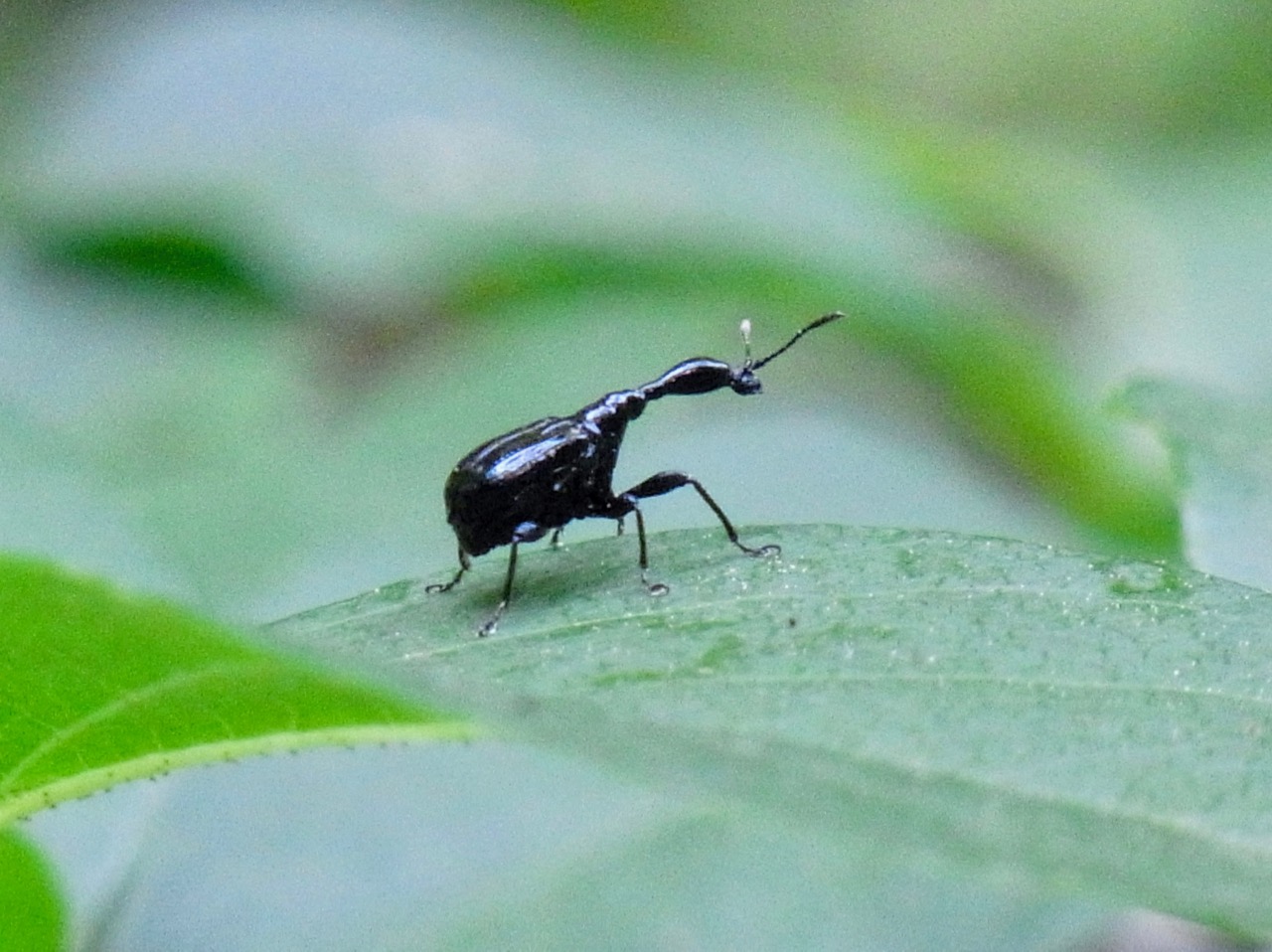 葉っぱの上に、黒い豆粒みたいな昆虫はいないかな。よくさがしてごらん。これがエゴツルクビオトシブミの成虫なんだ。こんなにちっちゃな昆虫が、体の何十倍にもなる大きさの葉っぱを器用に口で切り裂き折りたたみ、くるくるっと筒状に巻くんだ。とてもしっかりした丈夫な筒だよ。初めて見たとき、いったいどうやって作るんだろうと不思議に思ったもんだ。オトシブミの仲間は折り紙の名人だね。