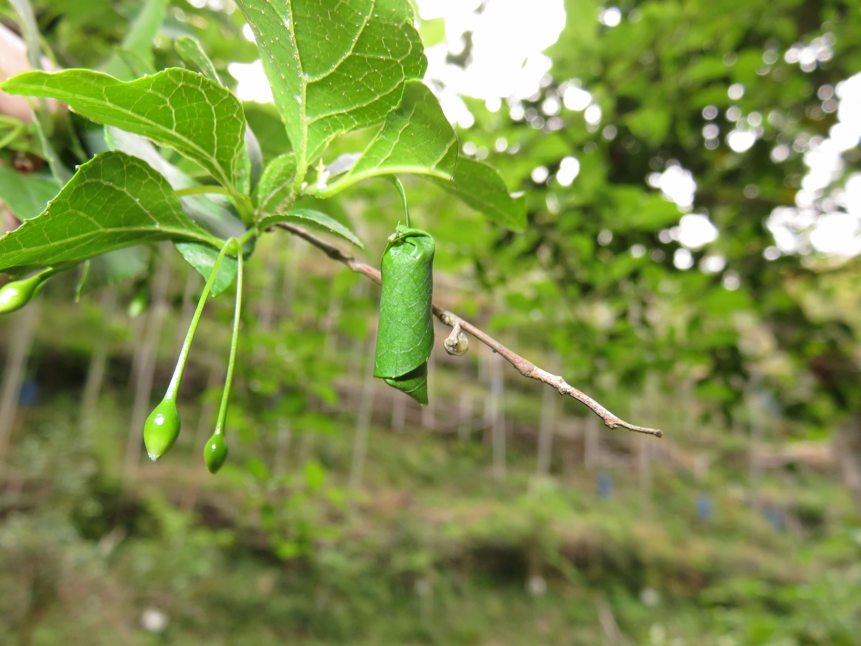 この筒の中には、卵が一つ入っている。ふ化した幼虫は筒の内側の葉っぱを食べて筒の中で蛹になり、羽化して出てくるんだ。手当たり次第に葉っぱを食べ散らかすイモムシとは違って、必要最小限の食料で成虫になる、とてもつつましい昆虫だよ。