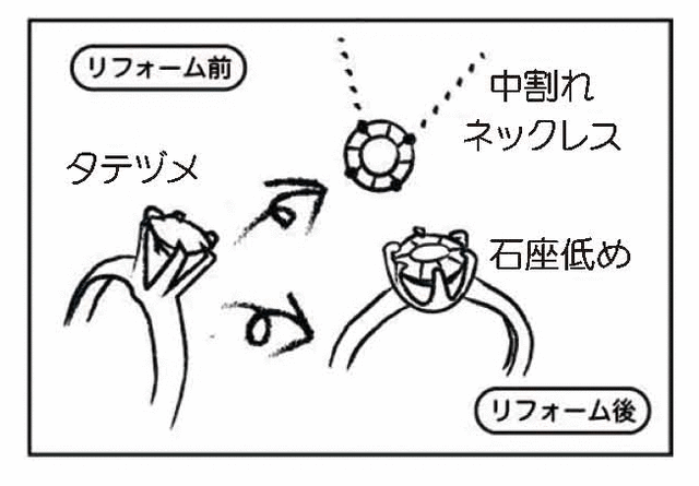 当店では、使わなくなったジュエリーのリフォームも承っています。特に多いのは、ダイヤモンドが高い位置で留められている「タテヅメ」と呼ばれるタイプの婚約指輪に関するご相談です。