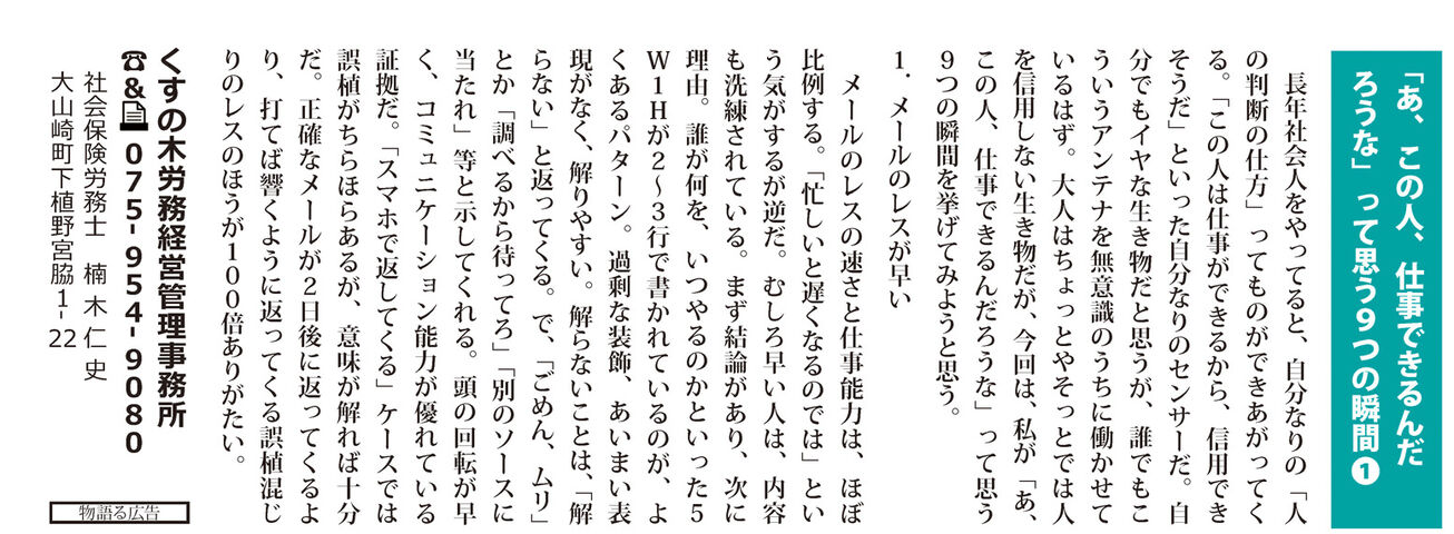 長年社会人をやってると、自分なりの「人の判断の仕方」ってものができあがってくる。「この人は仕事ができるから、信用できそうだ」といった自分なりのセンサーだ。自分でもイヤな生き物だと思うが、誰でもこういうアンテナを無意識のうちに働かせているはず。大人はちょっとやそっとでは人を信用しない生き物だが、今回は、私が「あ、この人、仕事できるんだろうな」って思う9つの瞬間を挙げてみようと思う。