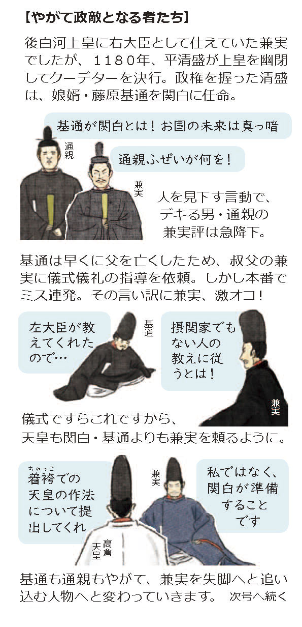 会議をボイコットしたり「持病」で欠勤したりするくせに、出席すれば場の空気を読まずに正論を吐き、論破する兼実。皆勤賞の「場の空気を正しく読む派」からすれば、「イヤな奴」。ですが、彼の禍根を残さない善後策に「正読派」はぐうの音も出ず…。「以仁王の乱」と義経による「頼朝追討宣旨要求」の会議の記述ではそんな様子が描かれていて、兼実のドヤ顔が目に浮かびます。