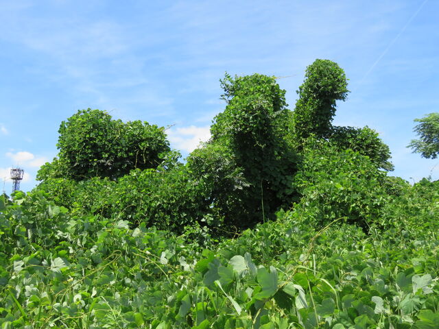 河川敷では、クズが繁茂している領域が拡大し続けている。かわいいカヤネズミが巣を作るオギの草原も、クズにおおわれて面積を減らしているんだ。クズは地上部を刈り取っても、地下にある栄養を蓄えた根から再び芽を出して伸びてくる。一度根付いてしまうと、駆除するのがとても困難な植物なんだ。