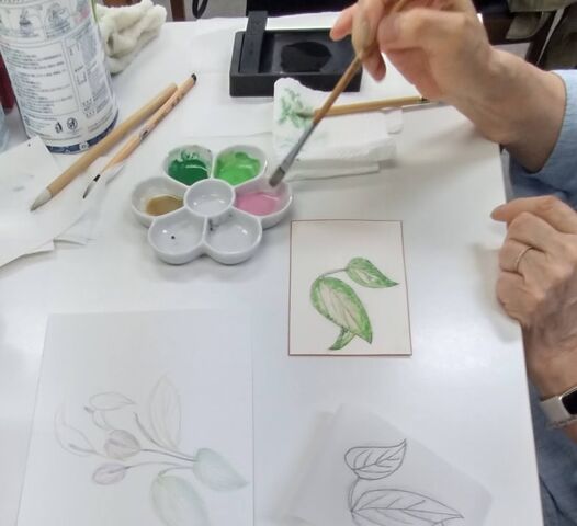 大山崎在住の日本画家・山本あずみさんに、絵具や道具、基本的な技法などを学び、はがきサイズの和紙に葉っぱなど自然のモチーフを描きます。絵具や道具は用意します。