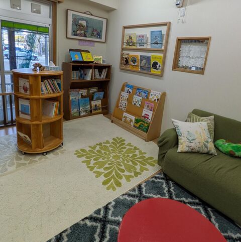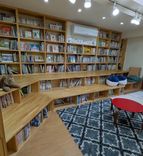 「本は読んでもらう(読む)ことで想像力がふくらみいろんな体験ができる。楽しい・悲しい・ワクワク・ドキドキなどいろんな感情も経験することができる。」――図書コーナーでは、座ったり寝転がったり、クッションにもたれたりして好きな姿勢で本が読め、本に集中することも、のんびりと過ごすこともできます。保護者や児童館の先生に読み聞かせをしてもらう子どもたち。本に囲まれている中でも家にいるような雰囲気となるように気を配られており、みんなの居場所となっていました。