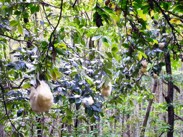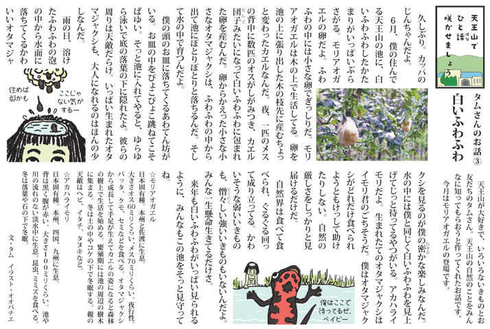 6月、僕の住んでる天王山の池に、白いふわふわしたかたまりがいっぱいぶらさがる。モリアオガエルの卵だよ。ふわふわの中には小さな卵でぎっしりだ。モリアオガエルは木の上で生活してる。卵を池の上に張り出した木の枝先に産むちょっと変わったカエルなんだ。夜、一匹のメスの背中に数匹のオスがしがみつき、カエル団子みたいになって白いふわふわに包まれた卵を産むんだ。卵からかえった小さな小さなオタマジャクシは、ふわふわの中から出て池にぽとりぽとりと落ちるんだ。そして水の中で育つんだよ。